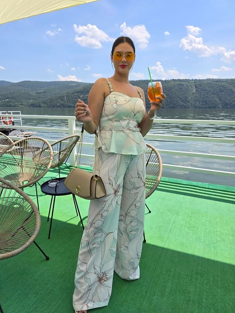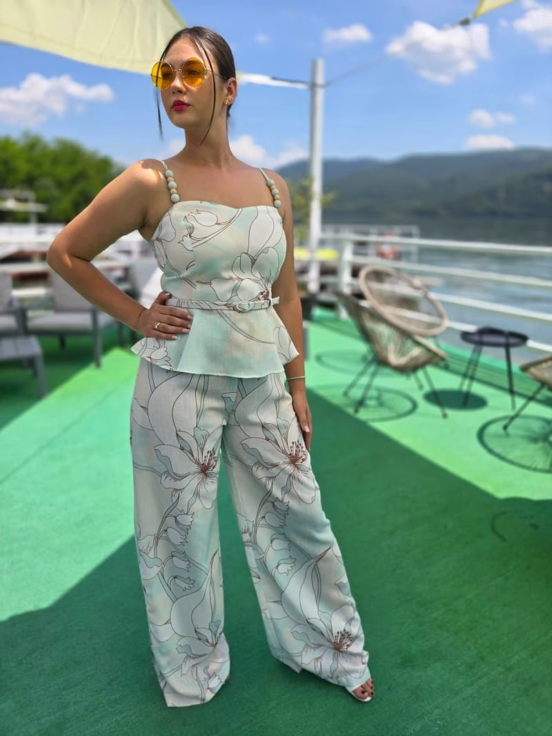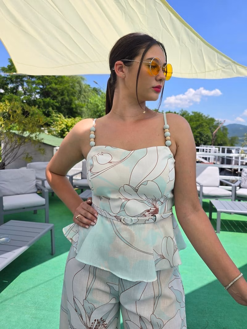 .•Top in bretele ,tip corset strans pe bust si in talie, cu peplum (volănaș în talie) ce accentuează silueta. Breteluțe sunt înguste,decorate cu mărgele mari, rotunde, care dau un aer chic. Imprimeu în nuanțe pastel, cu imprimeu floral mare în tonuri discrete. Are o centură detasabila subțire din același material, care marchează talia.
