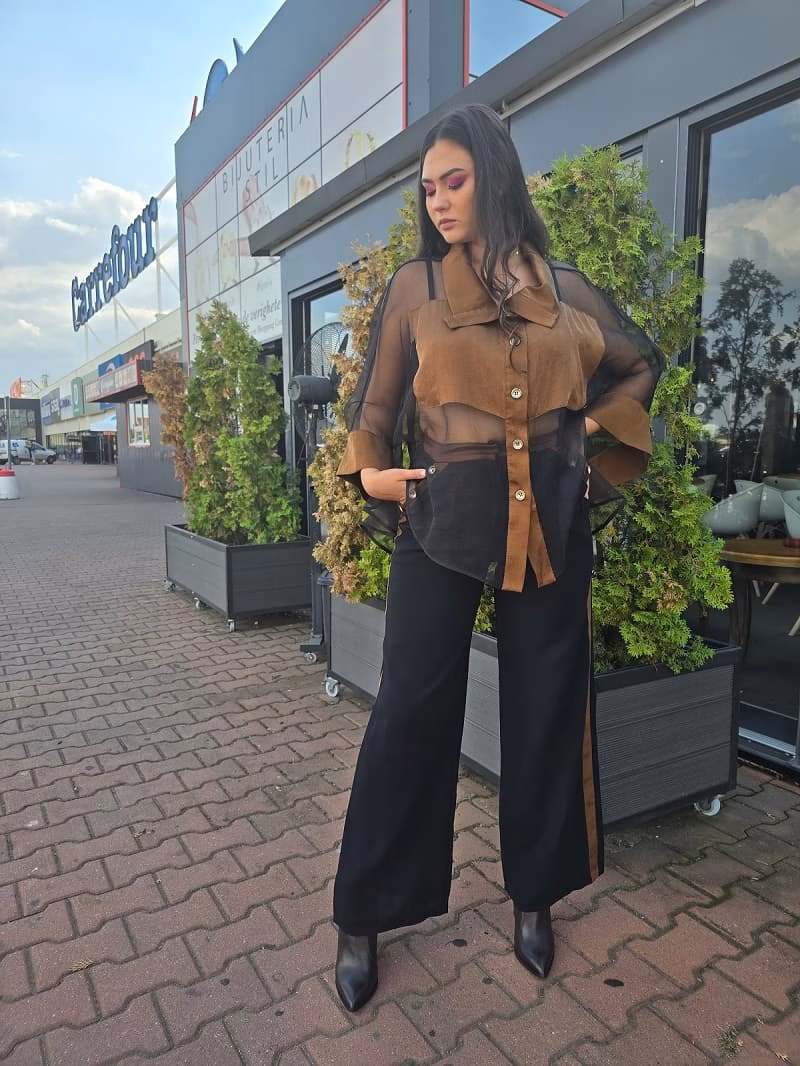 Set damă modern cu bluză lejera tip fluture, completat de pantaloni negri cu inserții laterale maro-caramel . Un outfit artistic și îndrăzneț.
