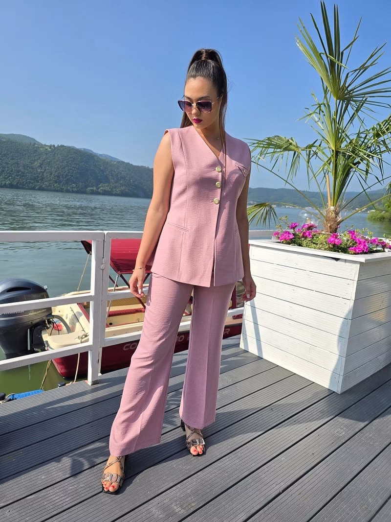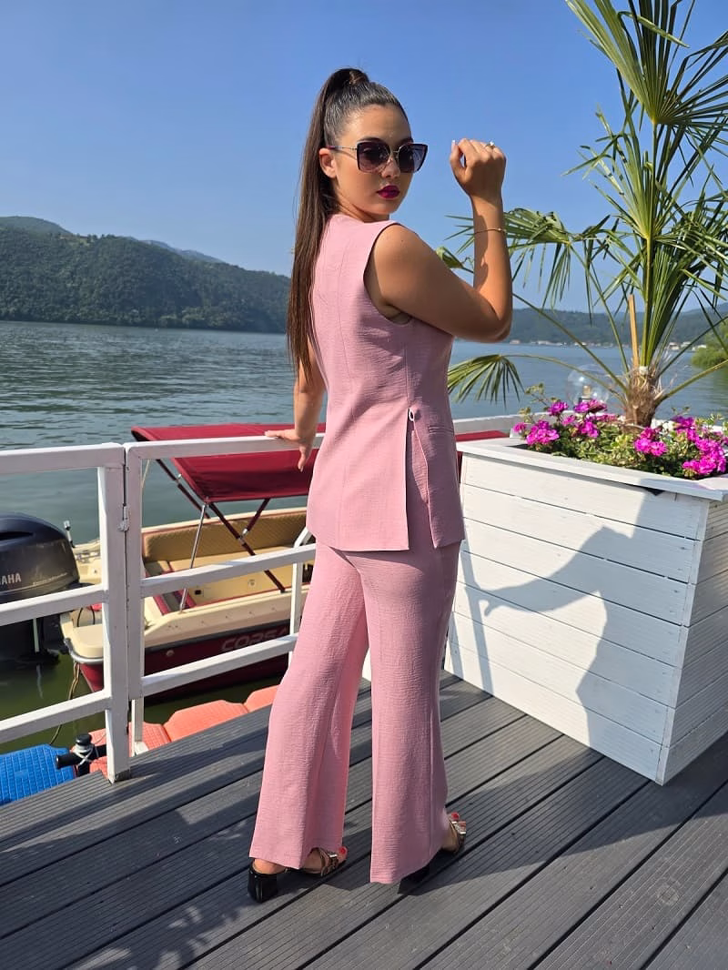 Compleu modern și ușor de purtat, în nuanța delicată roz, perfect pentru zilele călduroase sau întâlniri casual-elegante.