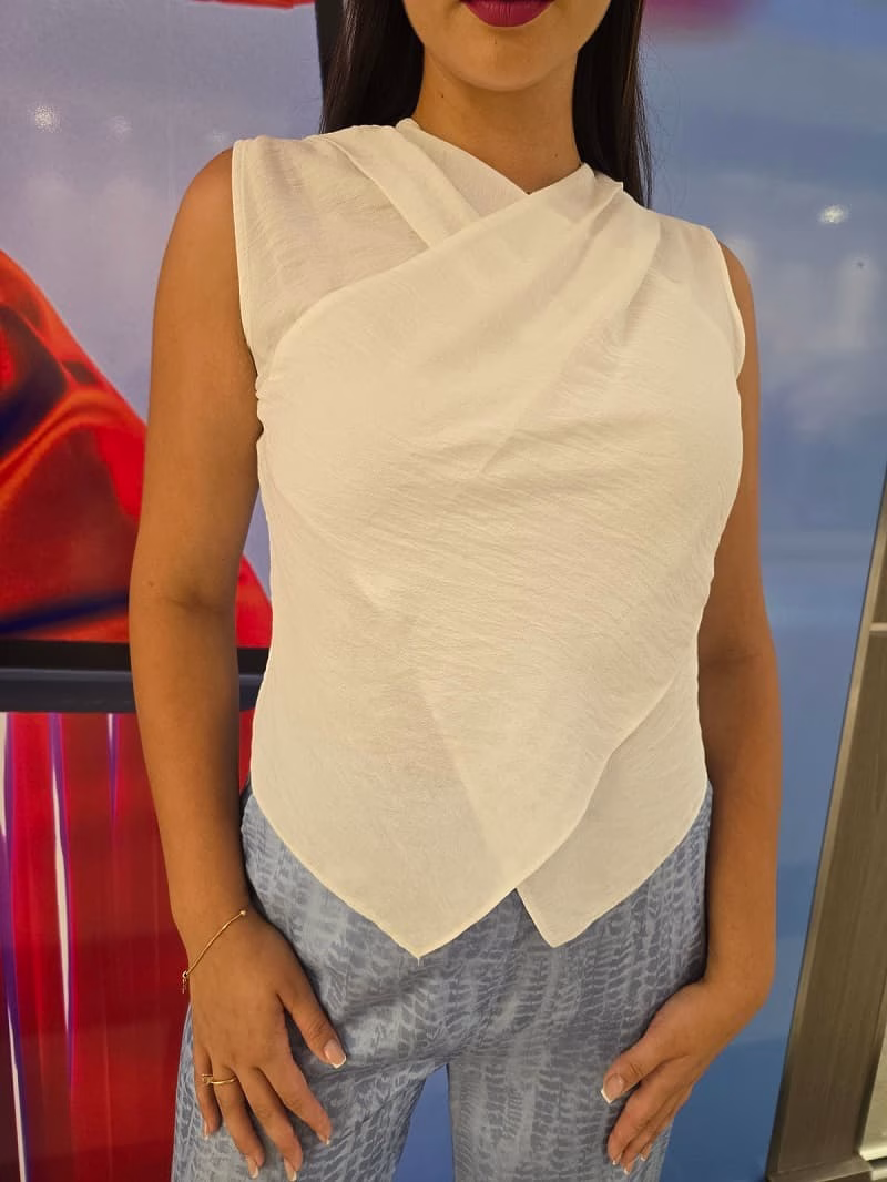 • top alb fără mâneci cu un design modern, decolteu drapat, croiala asimetrica in partea de jos, se închide pe fermoar la spate pe mijloc.