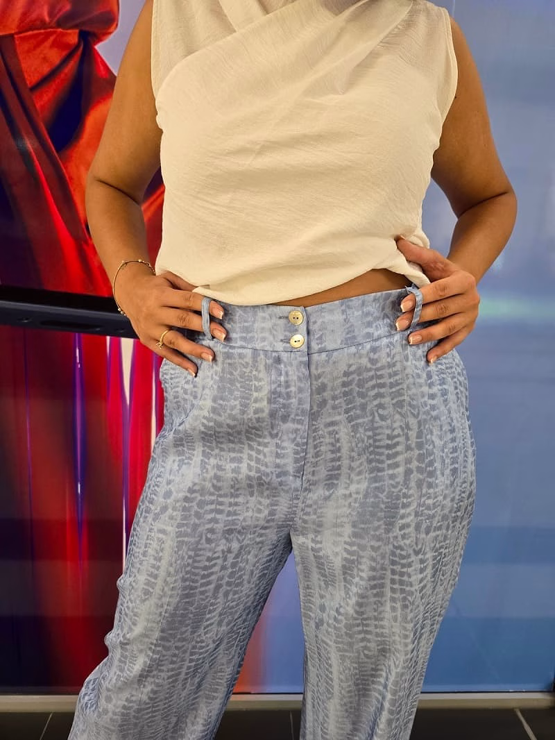 •Pantaloni largi, vaporoși, în nuanță de albastru deschis cu imprimeu discret alb.