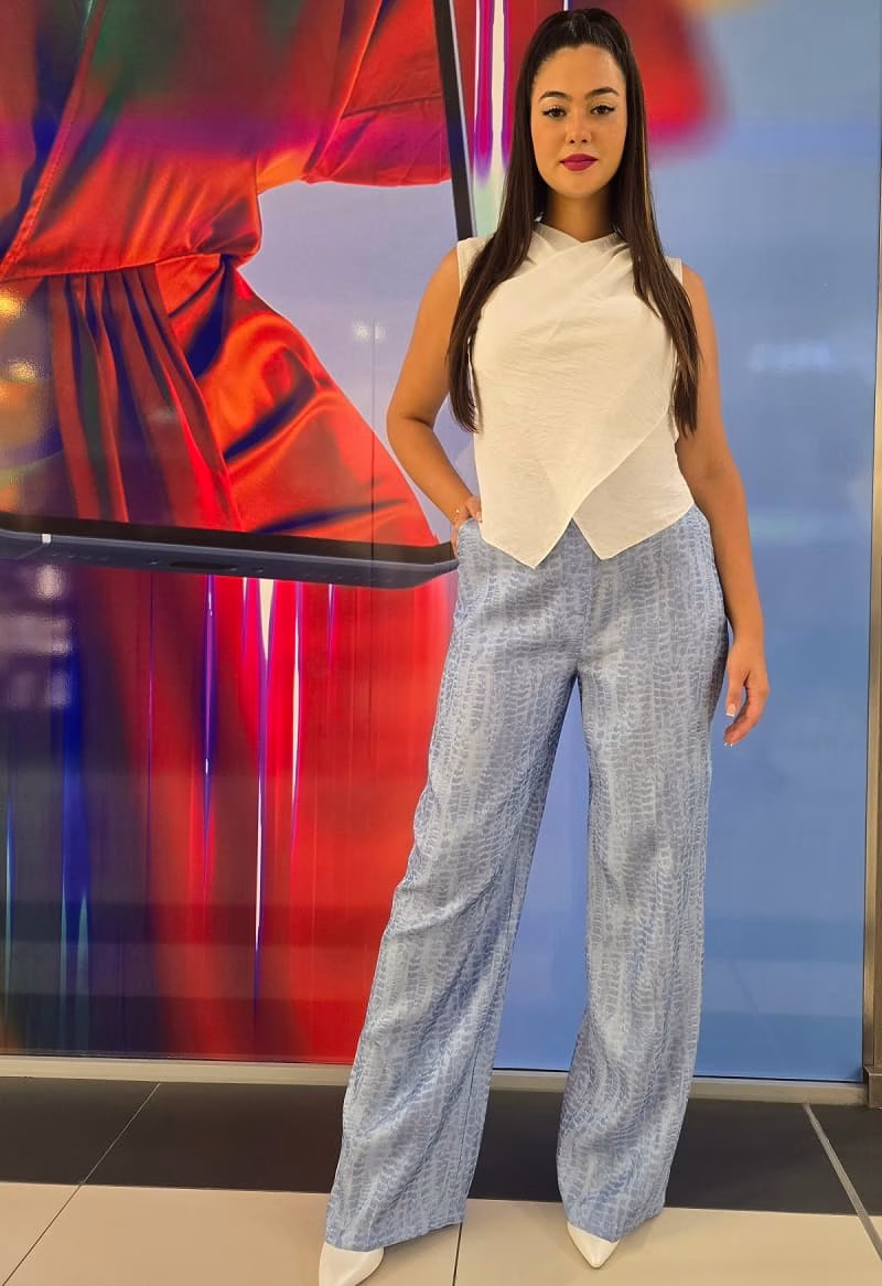 Compleu casual compus dintr-un top alb fără mâneci, cu design asimetric, și pantaloni vaporoși bleu, cu imprimeu subtil. O alegere relaxată și stilată pentru zilele calde sau pentru vacanță.