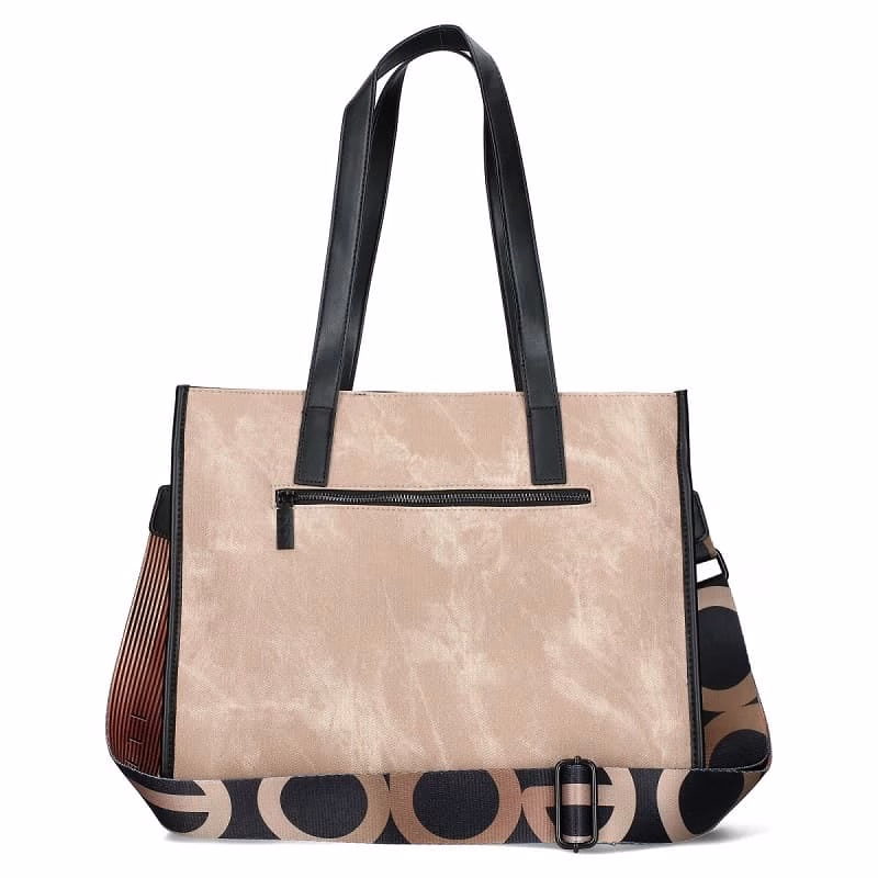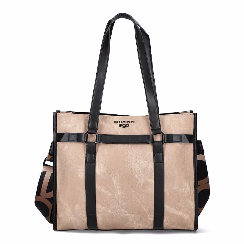 Geantă tote bej cu detalii negre. Elegantă și practică, ideală pentru birou sau ținute urbane.