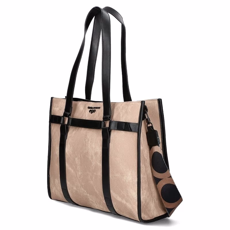 Geanta Mare din piele ecologică , spațioasă și structurată perfect pentru un look sofisticat și curat . Are un design minimalist și elegant , într-o nuanță de bej cu detalii negre . Stilul este versatil ușor de abordat cu multe ținute . Este prevăzută cu mânere mici pentru purtare în mână cât și o bretea lată si detașabilă pentru umăr .