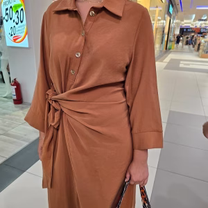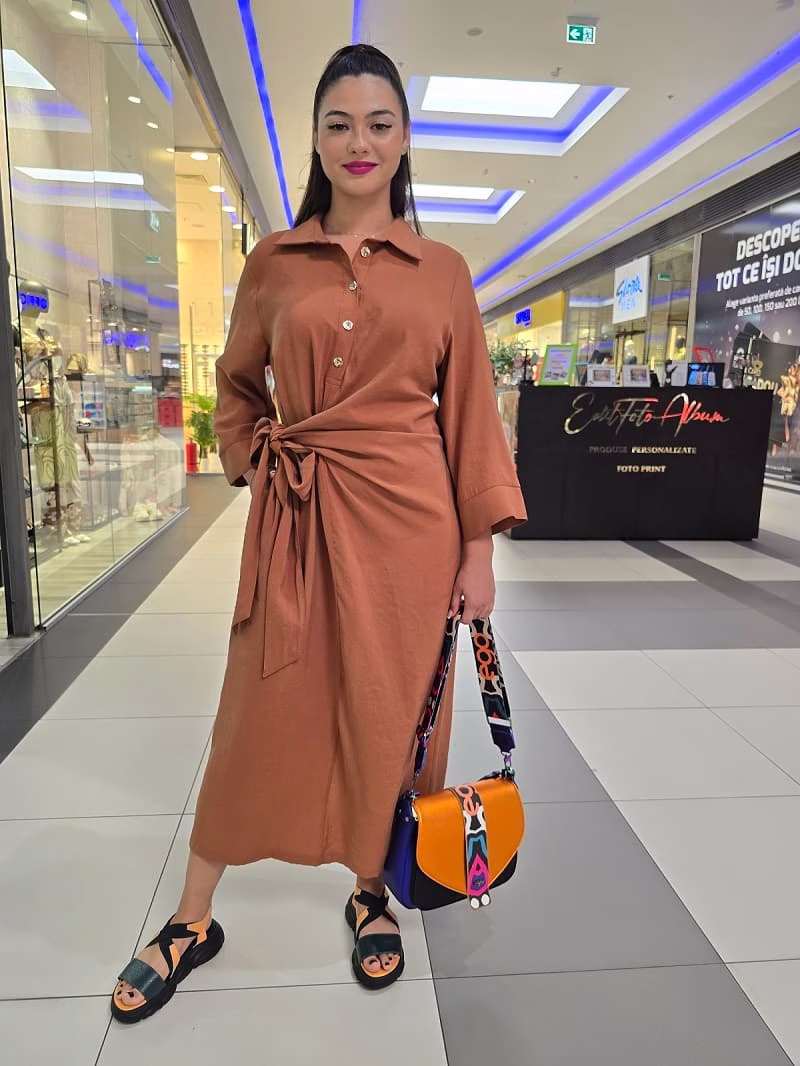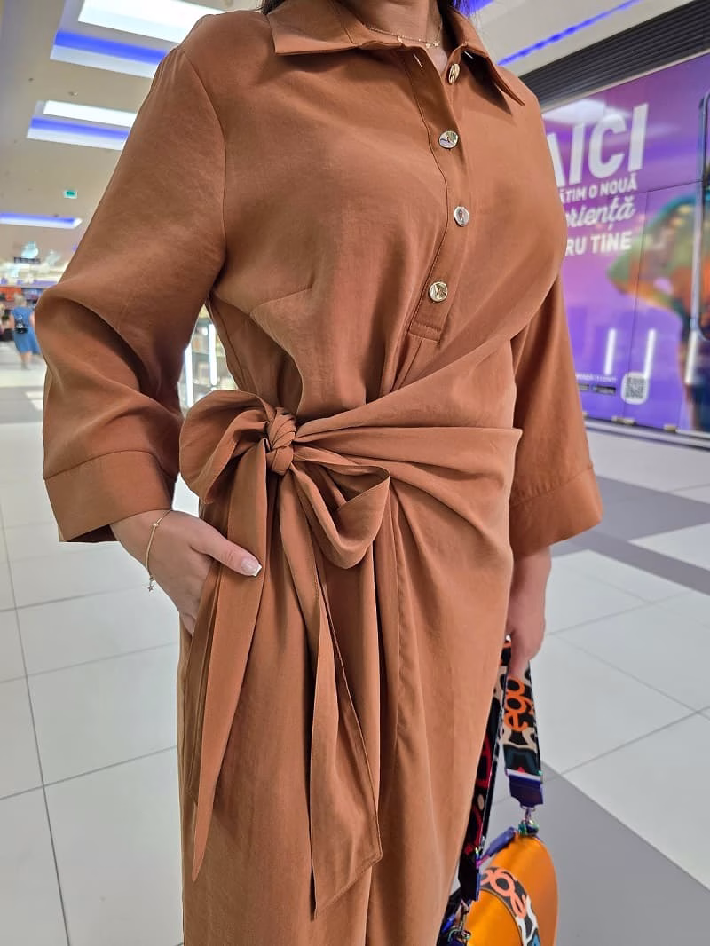 Rochie casual din bumbac, în nuanță caldă de maro arămiu. Croi lejer, guler cămașă și mâneci trei sferturi. Material ușor și plăcut pe piele – perfect pentru vară.