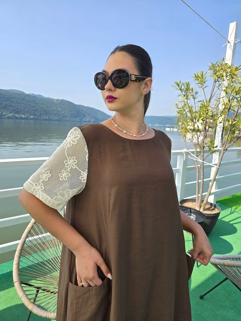 Rochia are un material natural de vascoza, este lejera pe corp, fiind o rochie usor de purtat in sezonul cald ,cu buzunare functionale.