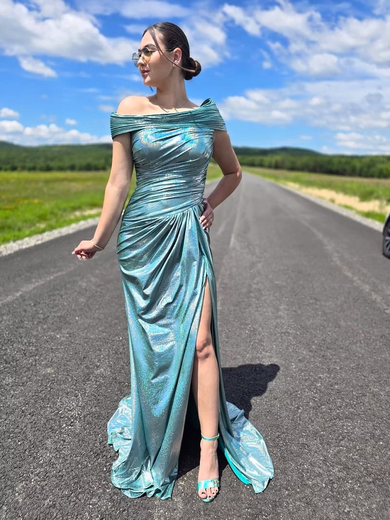 Rochie lunga eleganta, verde metalizat cu irizații strălucitoare.