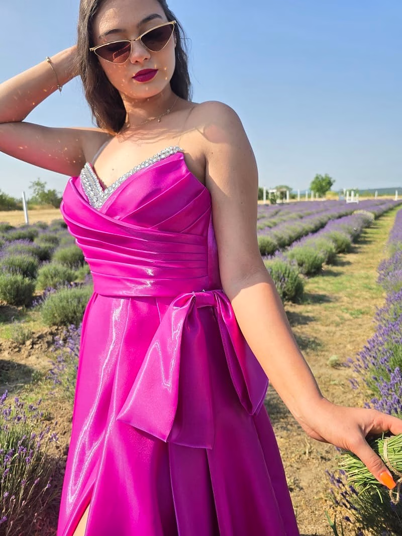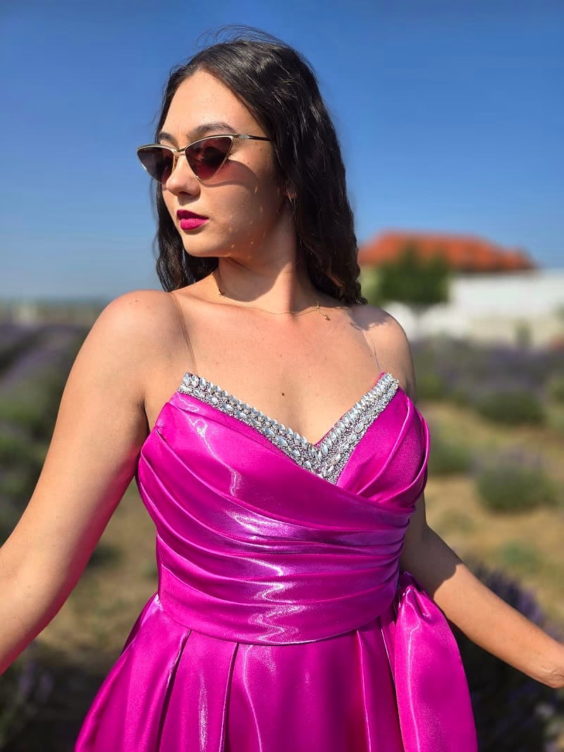 Rochie lungă Fucsia , elegantă, confecționată dintr-un material lucios, cu reflexii metalice subtile, într-o nuanță vibrantă.