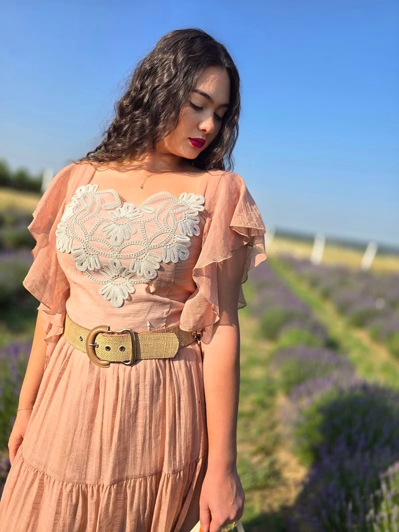 Mâneci scurte, vaporoase, tip volane, partea de jos a rochiei are mai multe straturi ușor plisate.