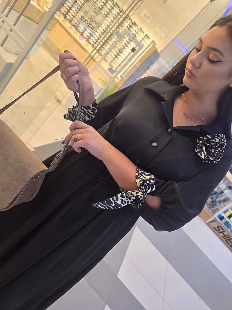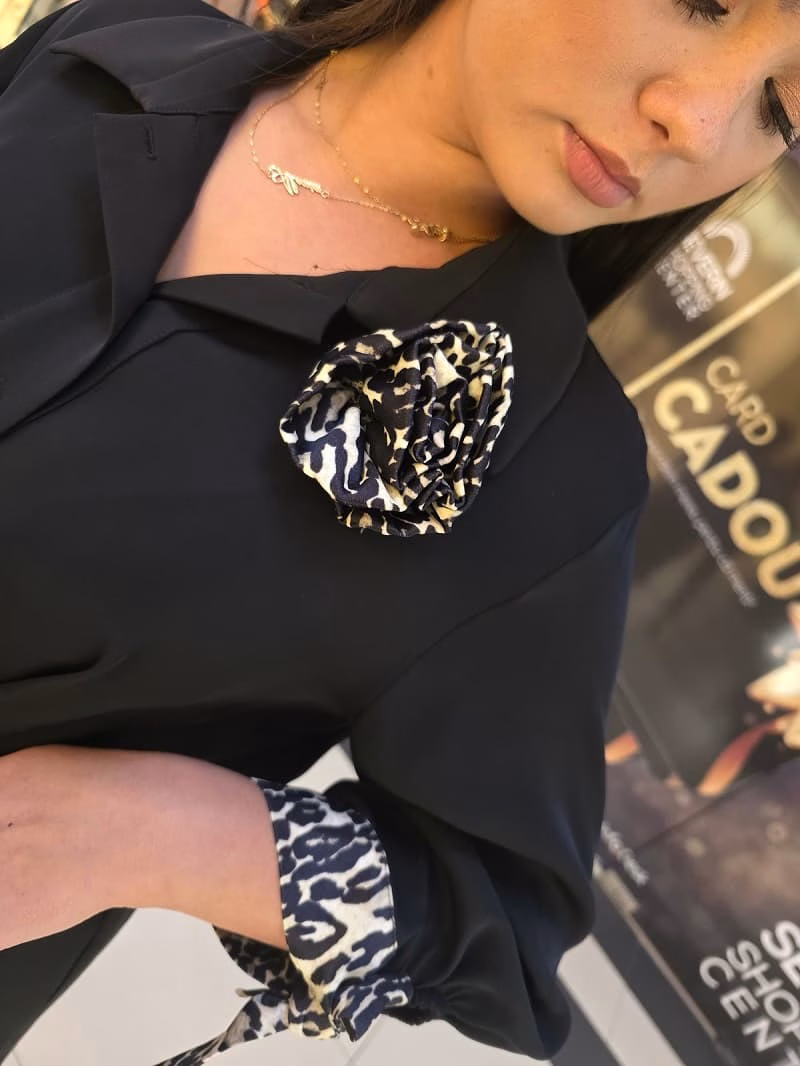 Maneci lungi bufante cu elastic la încheietură , oferind un aspect feminin și lejer , floare decorativă aplicată pe piept,accente animal print la maneci si pe floare.