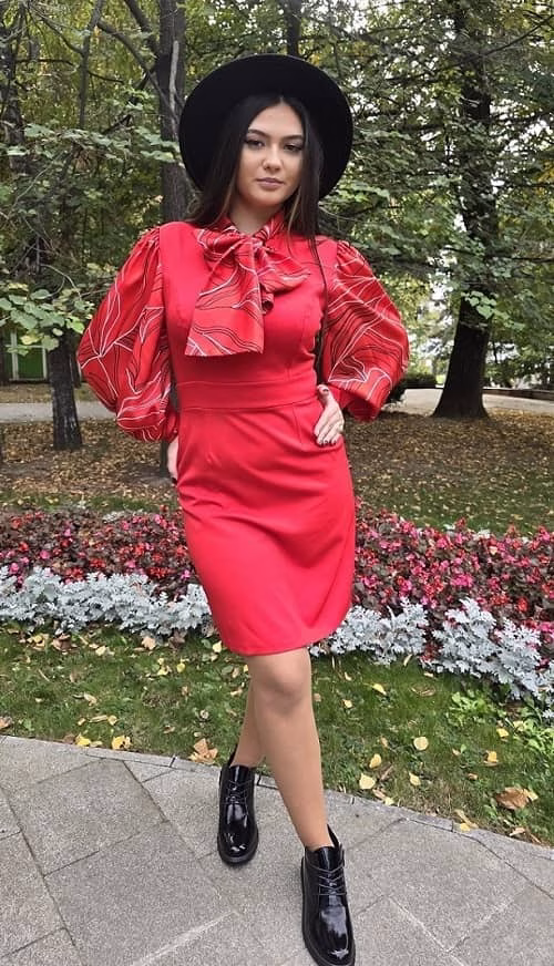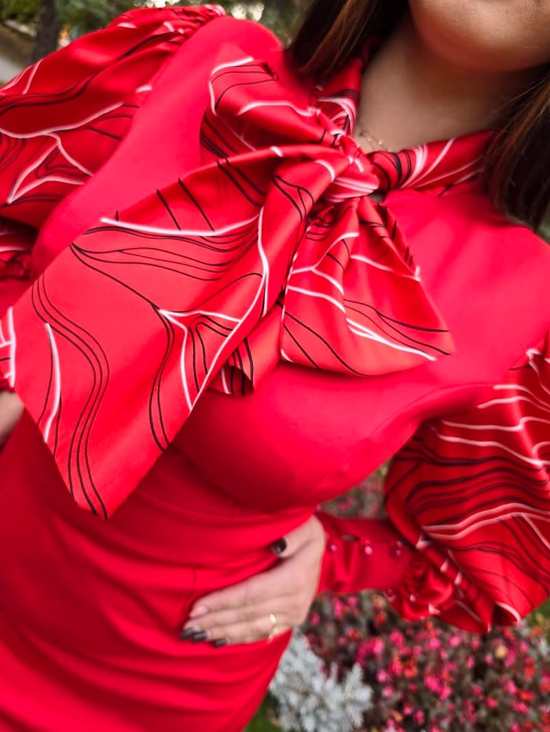 Rochie scurtă si mulata, nuanta Roșu cu maneci imprimate.