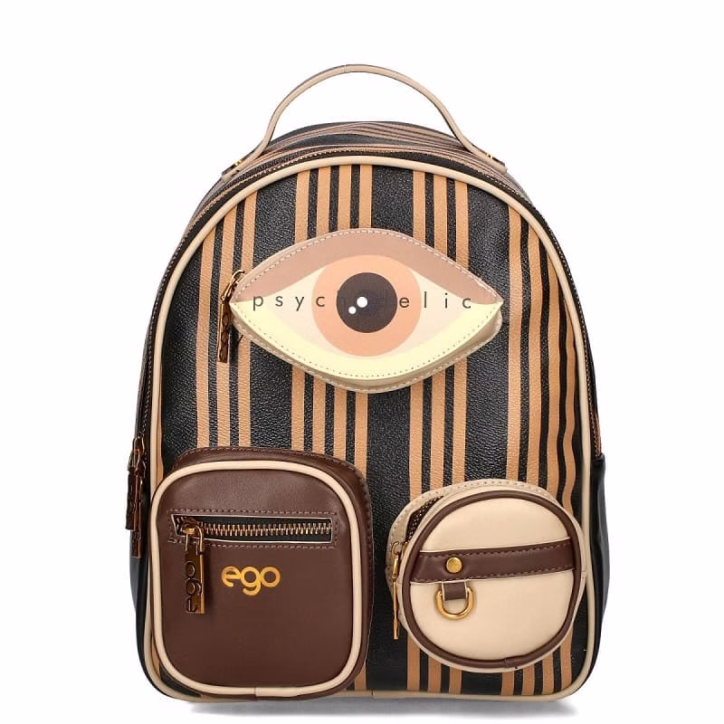 Ghiozdan Mare din Piele ecologica , negru in dungi verticale maro pe partea din față.